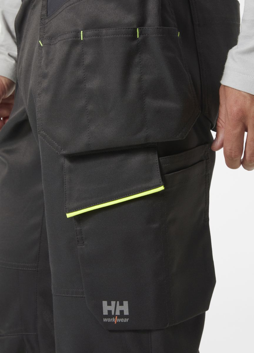 Die UC-ME CONSTRUCTION PANT CLASS 1 von Helly Hansen hält den harten Bedingungen auf der Baustelle stand. Praktische Hängetaschen mit doppelt gefüttertem Boden und Metallknöpfe mit einer schützenden Kunstmaterialebeschichtung sorgen für zusätzliche Strapazierfähigkeit. Die Bauhose aus Zwei-Wege-Stretchmaterial bietet mit Vorgeformten Knien und einem Zwickel im Schritt uneingeschränkte Bewegungsfreiheit. Das Werkzeug ist sicher und griffbereit in Außentaschen, einer speziellen Zollstocktasche und einer Oberschenkeltasche mit Klettverschluss untergebracht. Die Knieschoner können für optimalen Komfort von der Innenseite des Beins aus verstellt werden. Die Beinlänge kann unten an den Manschetten um fünf cm verlängert werden. Mit einer integrierten Ausweisschlaufe ist Ihre ID-Karte jederzeit sichtbar und griffbereit. Die Bauhose ist mit breiten reflektierende Streifen und einem gut sichtbaren materiale am Unterbein ausgestattet.