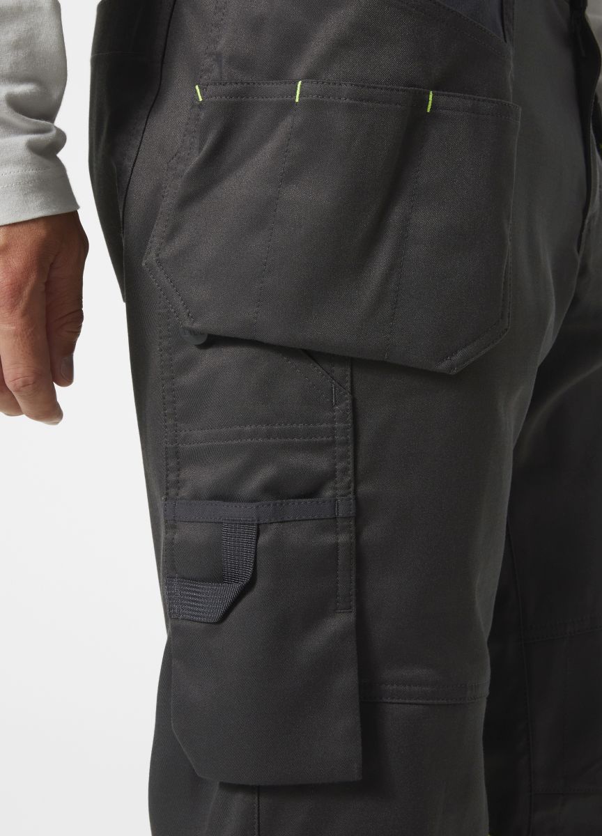 Die UC-ME CONSTRUCTION PANT CLASS 1 von Helly Hansen hält den harten Bedingungen auf der Baustelle stand. Praktische Hängetaschen mit doppelt gefüttertem Boden und Metallknöpfe mit einer schützenden Kunstmaterialebeschichtung sorgen für zusätzliche Strapazierfähigkeit. Die Bauhose aus Zwei-Wege-Stretchmaterial bietet mit Vorgeformten Knien und einem Zwickel im Schritt uneingeschränkte Bewegungsfreiheit. Das Werkzeug ist sicher und griffbereit in Außentaschen, einer speziellen Zollstocktasche und einer Oberschenkeltasche mit Klettverschluss untergebracht. Die Knieschoner können für optimalen Komfort von der Innenseite des Beins aus verstellt werden. Die Beinlänge kann unten an den Manschetten um fünf cm verlängert werden. Mit einer integrierten Ausweisschlaufe ist Ihre ID-Karte jederzeit sichtbar und griffbereit. Die Bauhose ist mit breiten reflektierende Streifen und einem gut sichtbaren materiale am Unterbein ausgestattet.
