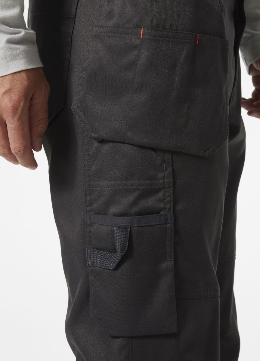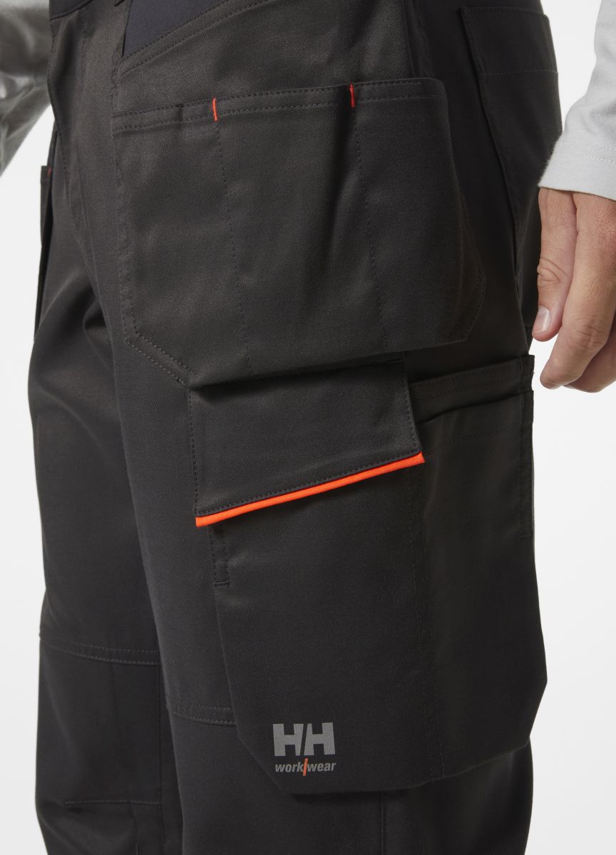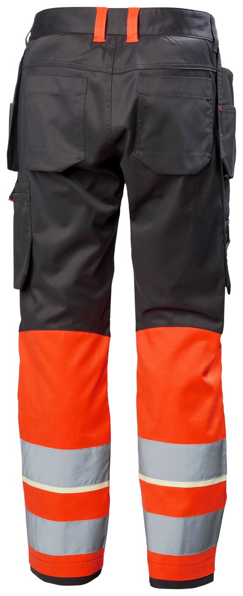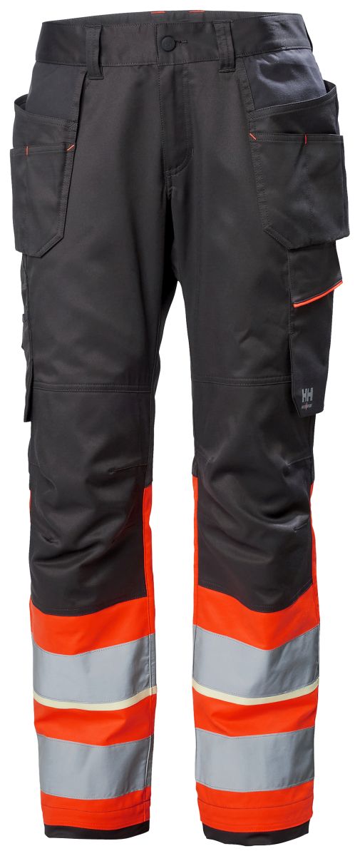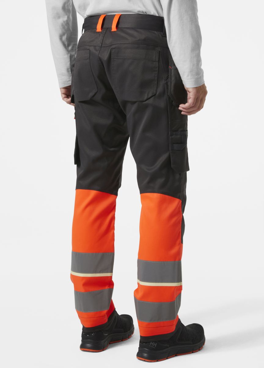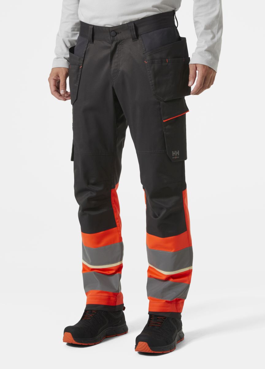 Die UC-ME CONSTRUCTION PANT CLASS 1 von Helly Hansen hält den harten Bedingungen auf der Baustelle stand. Praktische Hängetaschen mit doppelt gefüttertem Boden und Metallknöpfe mit einer schützenden Kunstmaterialebeschichtung sorgen für zusätzliche Strapazierfähigkeit. Die Bauhose aus Zwei-Wege-Stretchmaterial bietet mit Vorgeformten Knien und einem Zwickel im Schritt uneingeschränkte Bewegungsfreiheit. Das Werkzeug ist sicher und griffbereit in Außentaschen, einer speziellen Zollstocktasche und einer Oberschenkeltasche mit Klettverschluss untergebracht. Die Knieschoner können für optimalen Komfort von der Innenseite des Beins aus verstellt werden. Die Beinlänge kann unten an den Manschetten um fünf cm verlängert werden. Mit einer integrierten Ausweisschlaufe ist Ihre ID-Karte jederzeit sichtbar und griffbereit. Die Bauhose ist mit breiten reflektierende Streifen und einem gut sichtbaren materiale am Unterbein ausgestattet.