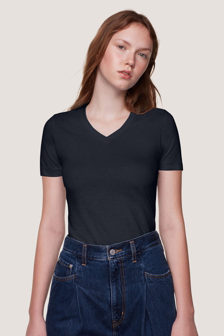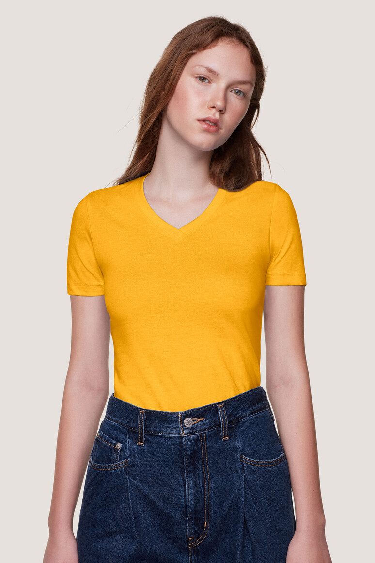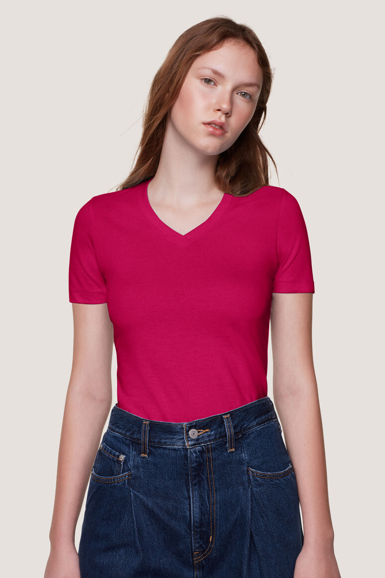 - Klassisches Damen-T-Shirt mit V-Ausschnitt und modisch schmalem Halsbündchen.