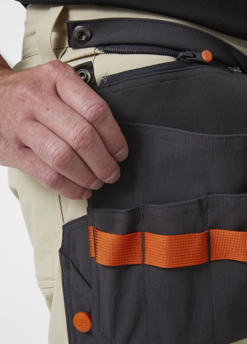 Bei der Kensington Construction Shorts wurde das umfassende Know-how von Helly Hansen im Bereich Arbeitskleidung für den Entwurf einer Cargo-Arbeitsshorts genutzt. Das Ergebnis ist ein industrielles Upgrade in Bezug auf Qualität, Bequemlichkeit und Komfort. Dank leichtem Vier-Wege-Stretchmaterial und Vorgeformten Knien folgt diese Shorts jeder Bewegung. Ein Zwickel im Schritt bietet zusätzliche Bewegungsfreiheit, während verstellbare Säume es Ihnen ermöglichen, die Shorts um 3 bzw. 5 cm zu verlängern. Zu den professionellen Details gehören eine breite Gürtelschlaufe in der Mitte des Rückens, kunstmaterialebeschichtete Metallknöpfe und eine Stretch-Cordura®-Verstärkung am unteren Saum. Oberschenkeltaschen mit YYK-Reißverschlüssen und Klettverschlüssen sorgen dafür, dass alles griffbereit ist. Gut durchdachte Details wie Ausweisschlaufe, integrierte Handytasche und reflektierende Details machen diese Cargo-Arbeitsshorts zu einem Muss auf jeder Baustelle.