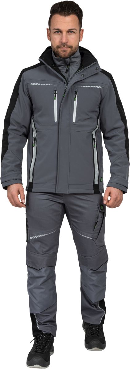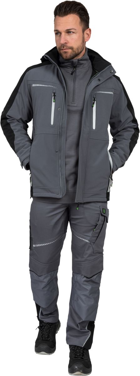 Die Winter-Softshelljacke, ist optimal für wechselhafte Wetterbedingungen konzipiert. Mit ihrem 3-Lagenlaminat-Softshell bietet sie Schutz und Komfort. Reflektierende Elemente erhöhen die Sichtbarkeit, während die abnehmbare Kapuze und der qualitativ hochwertige Frontreißverschluss zusätzlichen Schutz bieten. Praktische Features wie die verstellbaren Ärmelbündchen und das verlängerte Rückenteil sorgen für eine optimale Passform und Funktionalität.